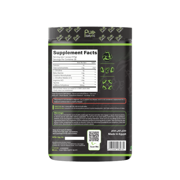 Pure Power – Pre Workout من شركة Pure Ganic هو مكمل غذائي قوي مصمم لرفع مستوى الطاقة والتركيز قبل التمرين، ومساعدتك على تحقيق أقصى أداء ممكن في الجيم.